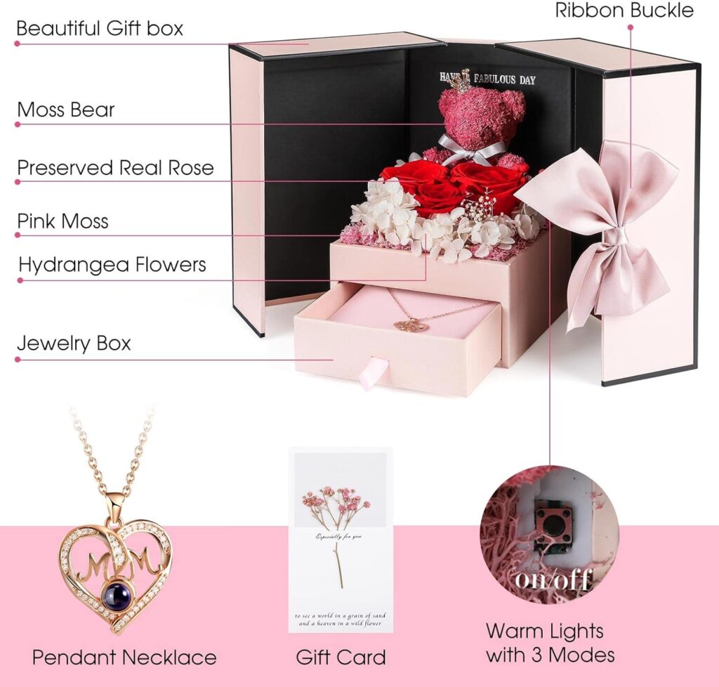This is the most romantic and emotionally expressive gift in the collection. The ADDWel gift box combines preserved roses, a cute bear, and a necklace with the “I love you in 100 languages” concept, which gives it a very memorable and symbolic feel. It is especially good when you want the gift to communicate love in a visually beautiful way.